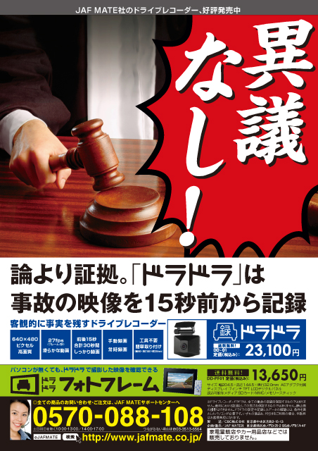 万が一事故に遭遇した時、自分に非が無くても証明が困難な場合があります。ドライブレコーダー「ドラドラ」を装着しておけば、鮮明な映像で状況が記録されるので安心。そのような商品特性を、裁判官の「異議なし!」という台詞とともにグラフィカルに表現。JAF MATE(2010年3月号)に掲載。