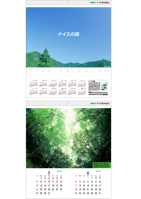 住宅用の木材メーカー「ナイス株式会社」のカレンダー。この会社では国内に三ケ所の山林を取得し、「ナイスの森」と名付けて保護・育成している。その森の写真をメインビジュアルにしたカレンダー。単純に美しい風景というだけでなく「森は空気を浄化し、生き物を育む事」を表現したくて、表紙には森の空を大きく写した写真を使用した。